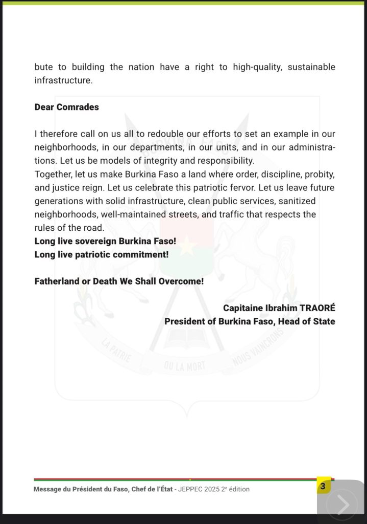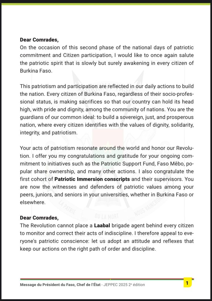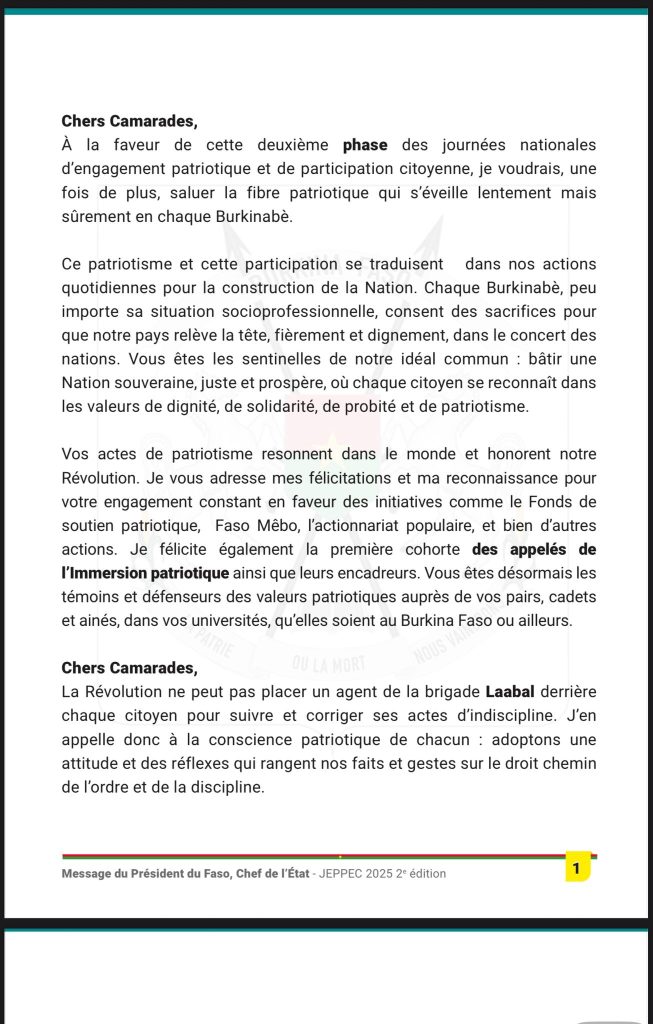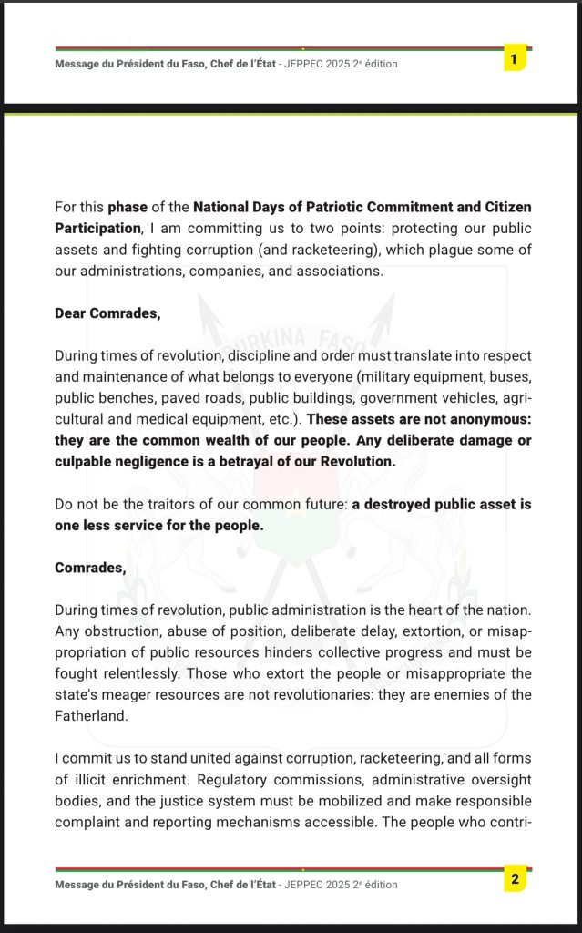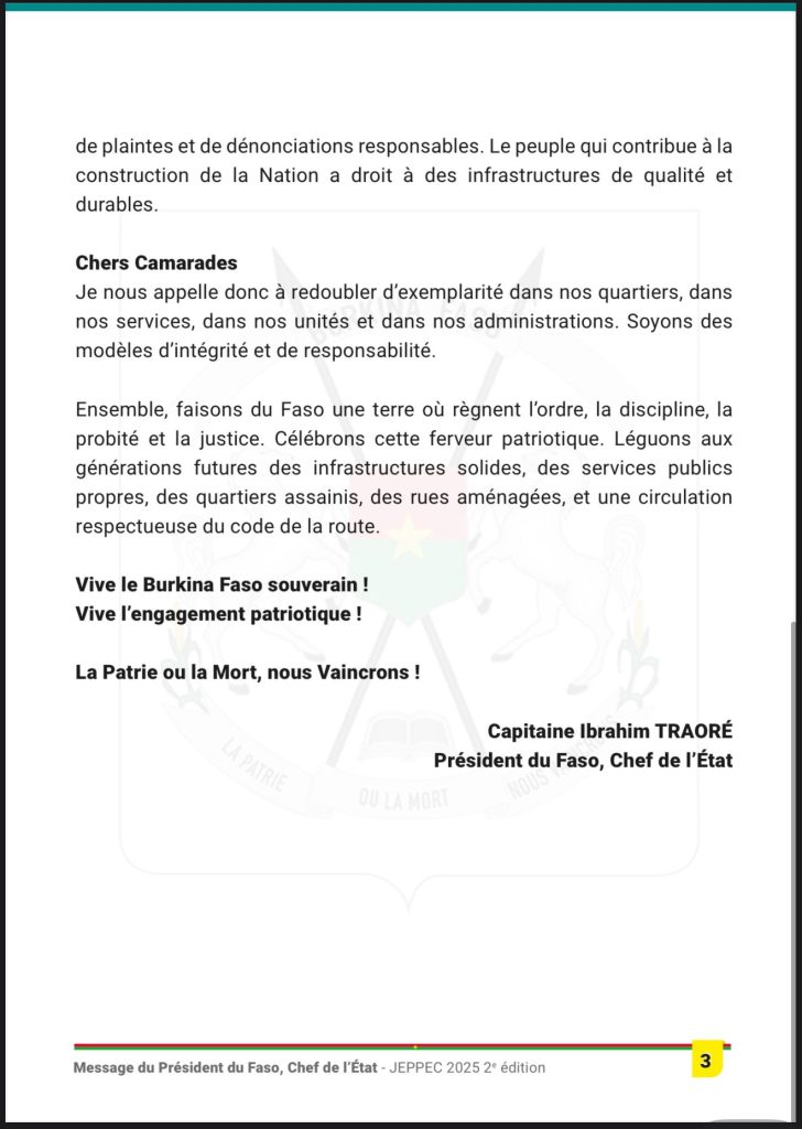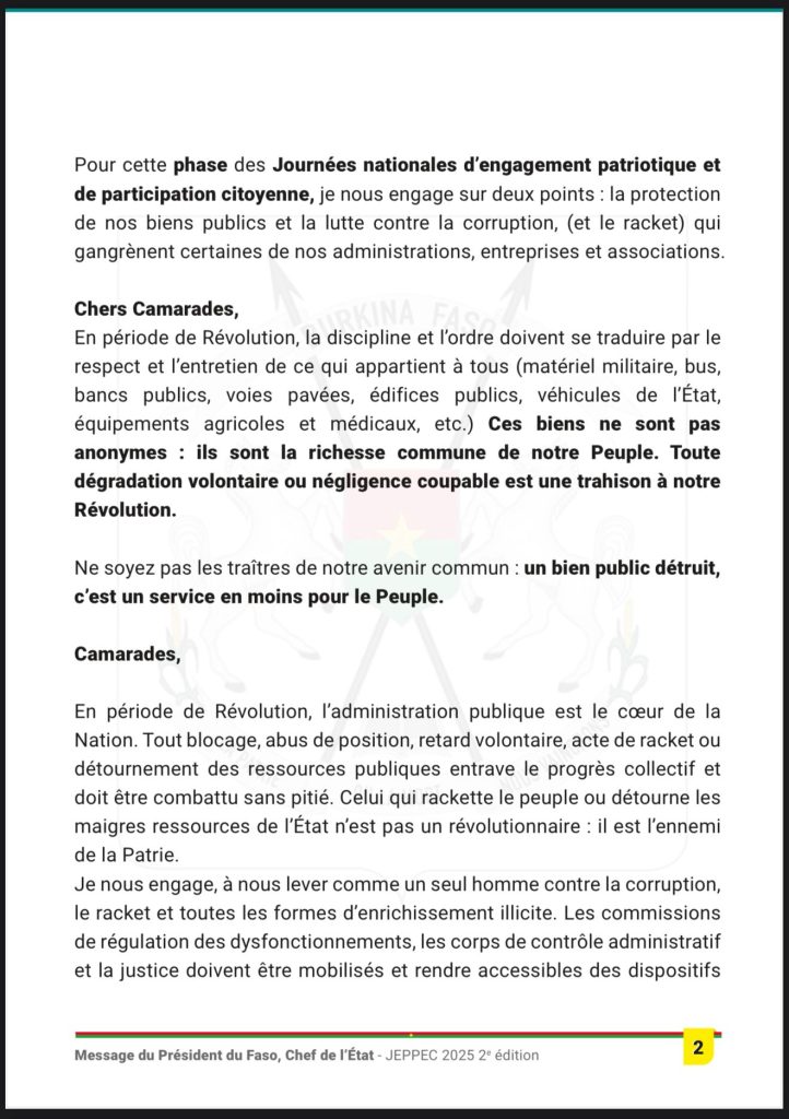 Le Capitaine Traoré insiste sur l’impérieuse nécessité d’engager les burkinabè sur la protection des biens publics et la lutte contre la corruption. Afin que cela soit réalité il en appelle au strict respect de la discipline et de l’ordre.