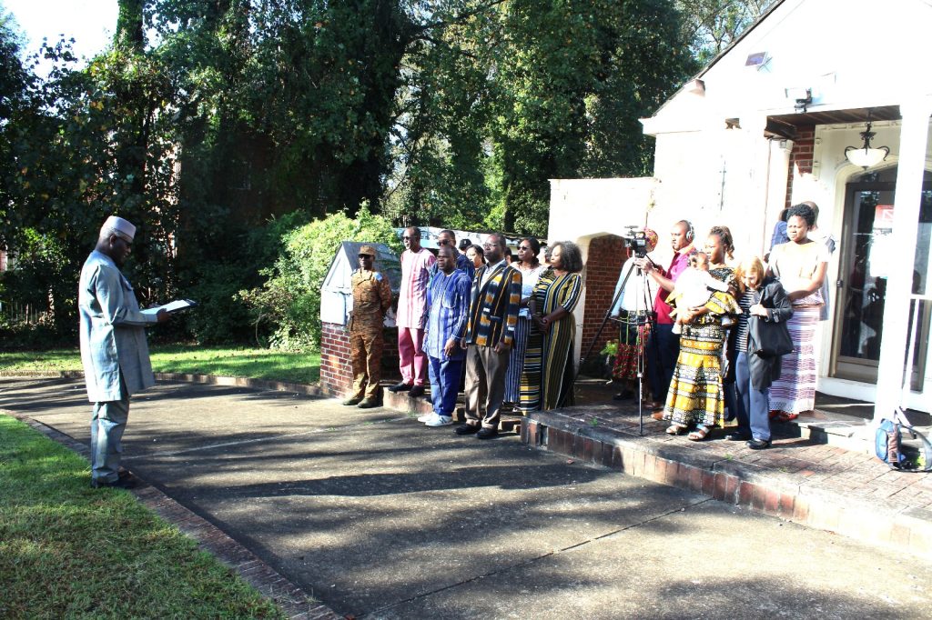c’est par une cérémonie de montée des couleurs que le personnel de l’Ambassade, réuni dans la cour de l’ancienne résidence sise sur la Sixteenth, autour du Représentant du Chef de l’Etat, a voulu marquer le démarrage de cette seconde phase d’expression de son attachement à la mère patrie.